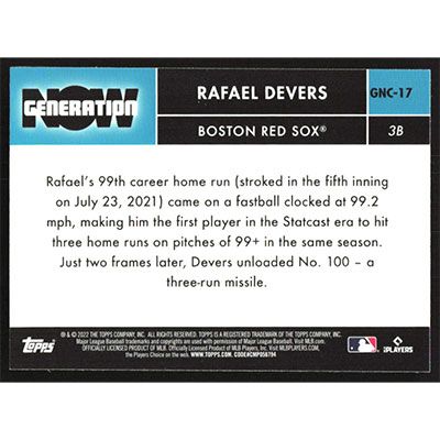 This is a 2022 Topps Chrome Update Generation Now Rafael Devers baseball card. The card is #GNC-17 and pictures show condition.