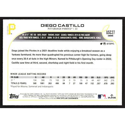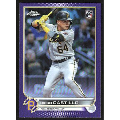 This is a 2022 Topps Chrome Update Purple Refractors Diego Castillo baseball card. The card is #USC27 and pictures show condition. Team(s): Pittsburgh Pirates Rookie Card (RC)