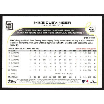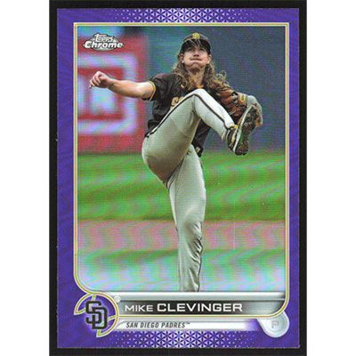 This is a 2022 Topps Chrome Update Purple Refractors Mike Clevinger baseball card. The card is #USC71 and pictures show condition. Team(s): San Diego Padres