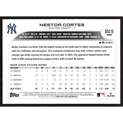 This is a 2022 Topps Chrome Update Nestor Cortes baseball card. The card is #USC10 and pictures show condition.