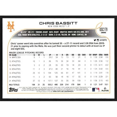 This is a 2022 Topps Chrome Update Chris Bassitt baseball card. The card is #USC179 and pictures show condition.
