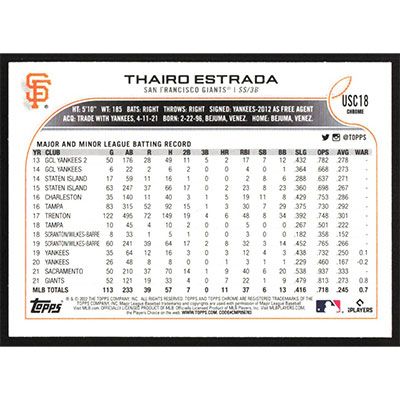This is a 2022 Topps Chrome Update Thairo Estrada baseball card. The card is #USC18 and pictures show condition.