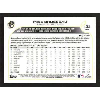 This is a 2022 Topps Chrome Update Mike Brosseau baseball card. The card is #USC4 and pictures show condition.