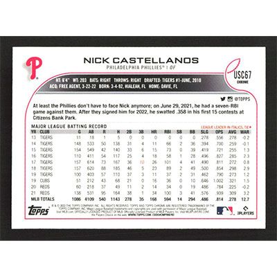 This is a 2022 Topps Chrome Update Nick Castellanos baseball card. The card is #USC67 and pictures show condition.