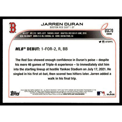 This is a 2022 Topps Chrome Update Jarren Duran Rookie Debut baseball card. The card is #USC70 and pictures show condition. Team(s): Boston Red Sox Rookie Card (RC)