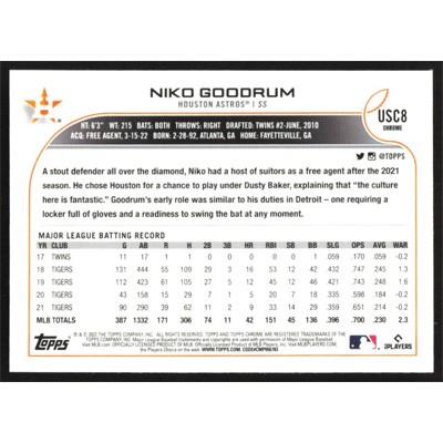 This is a 2022 Topps Chrome Update Niko Goodrum baseball card. The card is #USC8 and pictures show condition.