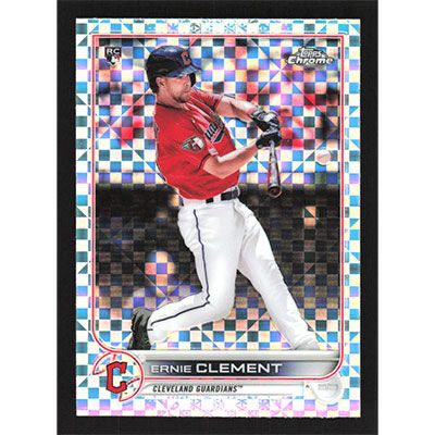 This is a 2022 Topps Chrome X-Fractors Ernie Clement baseball card. The card is #145 and pictures show condition. Team(s): Cleveland Guardians Rookie Card (RC)
