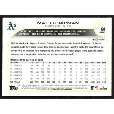 This is a 2022 Topps Chrome X-Fractors Matt Chapman baseball card. The card is #168 and pictures show condition.