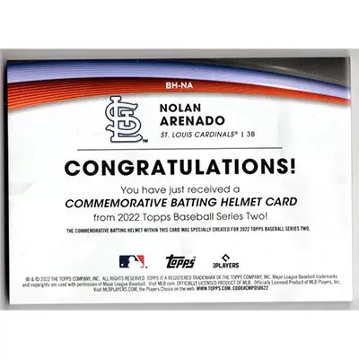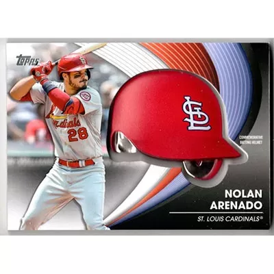 This is a 2022 Topps Commemorative Batting Helmet Relics Nolan Arenado baseball card. The card is #BH-NA and pictures show condition. Team(s): St. Louis Cardinals