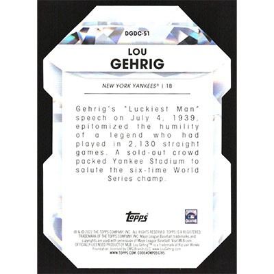 This is a 2022 Topps Diamond Greats Die Cuts Lou Gehrig baseball card. The card is #DGDC-51 and pictures show condition.