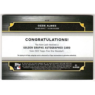 This is a 2022 Topps Five Star Golden Graphs Green Ozzie Albies autographed baseball card. This card has been signed, in gold paint pen, by Ozzie Albies, and is certified authentic by Topps. The card is #GG-OA and pictures show condition. This card is limited; #'d 03/15.