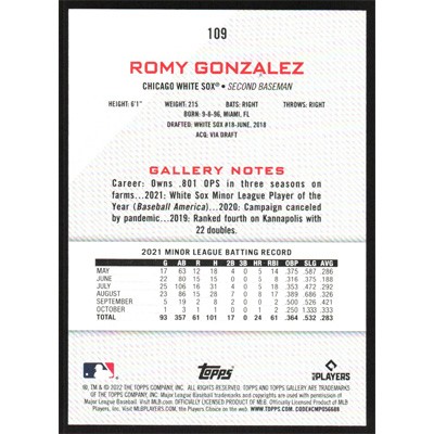 This is a 2022 Topps Gallery Romy Gonzalez baseball card. The card is #109 and pictures show condition.