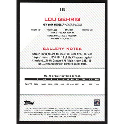 This is a 2022 Topps Gallery Lou Gehrig baseball card. The card is #110 and pictures show condition.