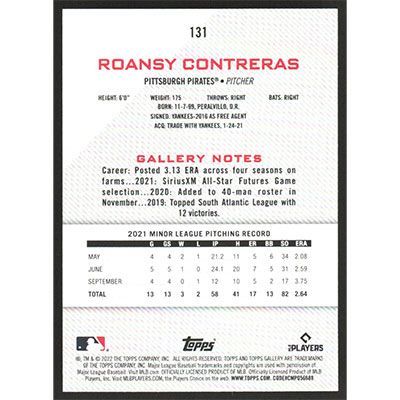This is a 2022 Topps Gallery Roansy Contreras baseball card. The card is #131 and pictures show condition. Team(s): Pittsburgh Pirates Rookie Card (RC)