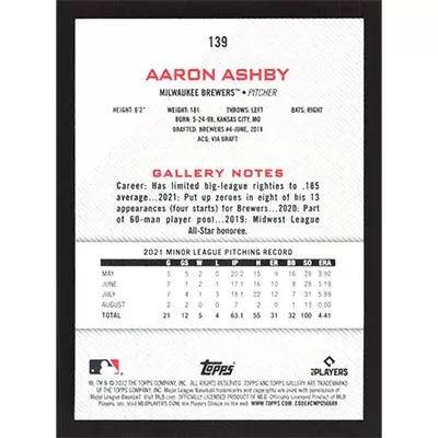 This is a 2022 Topps Gallery Aaron Ashby baseball card. The card is #139 and pictures show condition.
