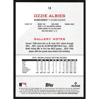 This is a 2022 Topps Gallery Ozzie Albies baseball card. The card is #14 and pictures show condition.