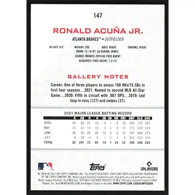 This is a 2022 Topps Gallery Ronald Acuña Jr. baseball card. The card is #147 and pictures show condition.