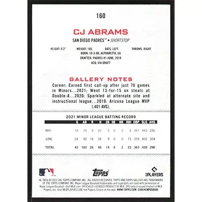 This is a 2022 Topps Gallery CJ Abrams baseball card. The card is #160 and pictures show condition.