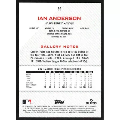 This is a 2022 Topps Gallery Ian Anderson baseball card. The card is #39 and pictures show condition.