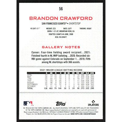 This is a 2022 Topps Gallery Brandon Crawford baseball card. The card is #56 and pictures show condition.