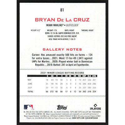 This is a 2022 Topps Gallery Bryan De La Cruz baseball card. The card is #81 and pictures show condition.