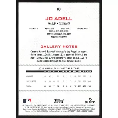 This is a 2022 Topps Gallery Jo Adell baseball card. The card is #83 and pictures show condition.