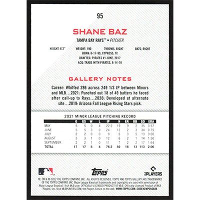 This is a 2022 Topps Gallery Shane Baz baseball card. The card is #95 and pictures show condition.