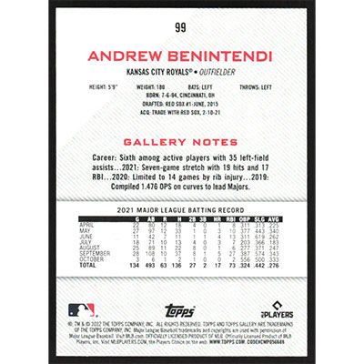 This is a 2022 Topps Gallery Andrew Benintendi baseball card. The card is #99 and pictures show condition.