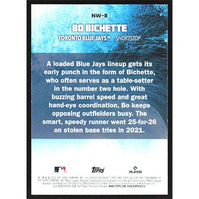 This is a 2022 Topps Gallery Next Wave Bo Bichette baseball card. The card is #NW-8 and pictures show condition.