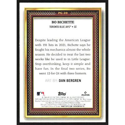 This is a 2022 Topps Gallery Portrait Gallery Bo Bichette baseball card. The card is #PG-20 and pictures show condition.