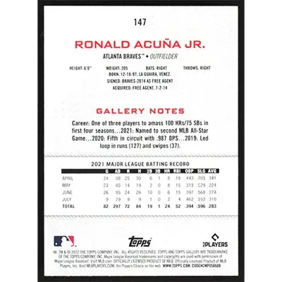 This is a 2022 Topps Gallery Printer Proof Ronald Acuña Jr. baseball card. The card is #147 and pictures show condition.