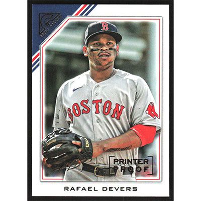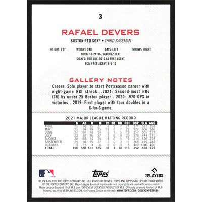 This is a 2022 Topps Gallery Printer Proof Rafael Devers baseball card. The card is #3 and pictures show condition.
