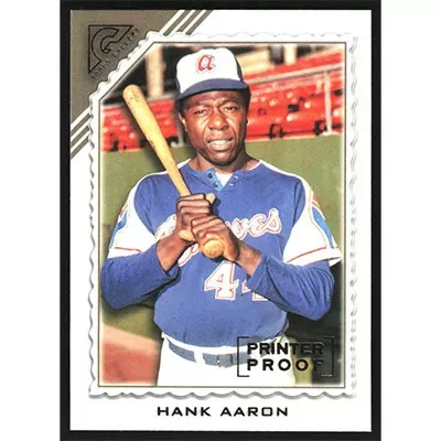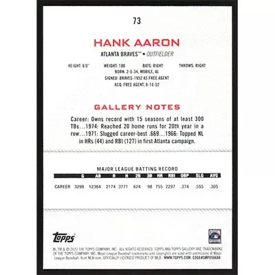 This is a 2022 Topps Gallery Printer Proof Hank Aaron baseball card. The card is #73 and pictures show condition.