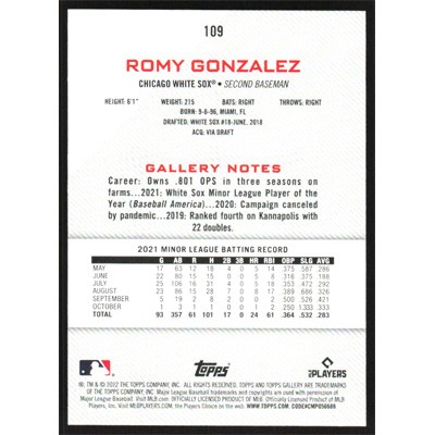 This is a 2022 Topps Gallery Rainbow Foil Romy Gonzalez baseball card. The card is #109 and pictures show condition.
