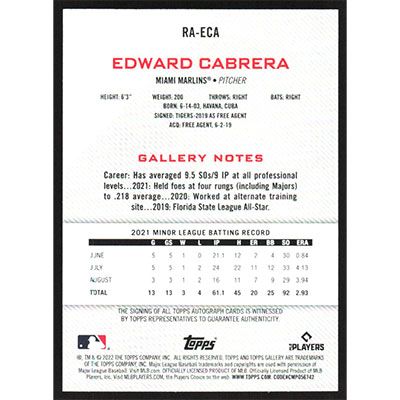 This is a 2022 Topps Gallery Rookie Autographs Edward Cabrera autographed baseball card. This card has been signed, in blue, by Edward Cabrera, and is certified authentic by Topps. The card is #RA-ECA and pictures show condition.