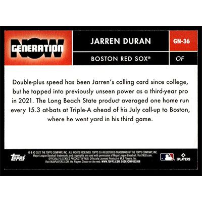 This is a 2022 Topps Generation Now Jarren Duran baseball card. The card is #GN-36 and pictures show condition. Team(s): Boston Red Sox Rookie Card (RC)