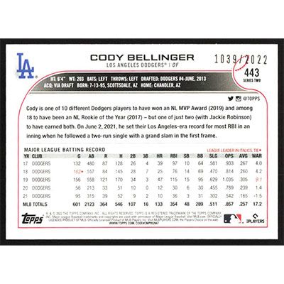 This is a 2022 Topps Gold Cody Bellinger baseball card. The card is #443 and pictures show condition. This card is limited; #'d 1039/2022. Team(s): Los Angeles Dodgers