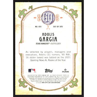 This is a 2022 Topps Gypsy Queen Adolis Garcia baseball card. The card is #103 and pictures show condition.