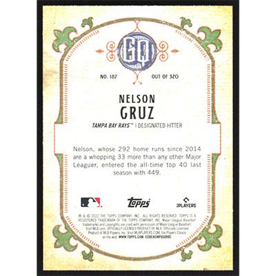 This is a 2022 Topps Gypsy Queen Nelson Cruz baseball card. The card is #187 and pictures show condition.