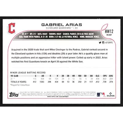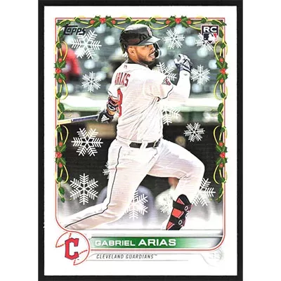 This is a 2022 Topps Holiday Gabriel Arias baseball card. The card is #HW12 and pictures show condition. Team(s): Cleveland Guardians Rookie Card (RC)