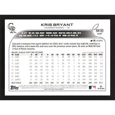 This is a 2022 Topps Holiday Kris Bryant baseball card. The card is #HW169 and pictures show condition.