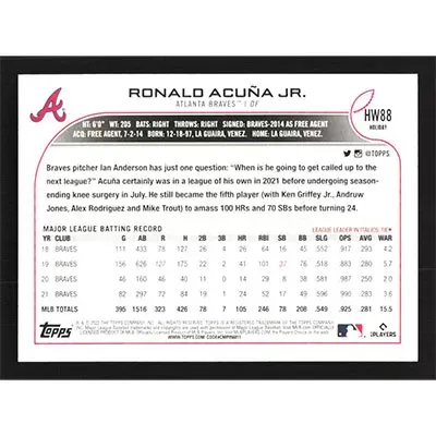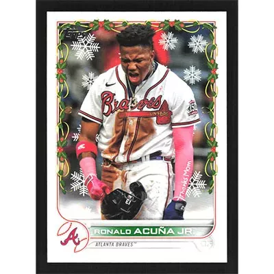 This is a 2022 Topps Holiday Ronald Acuña Jr. baseball card. The card is #HW88 and pictures show condition.