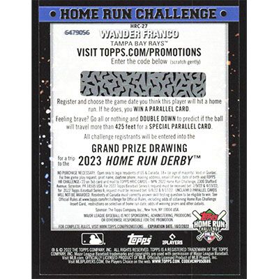This is a 2022 Topps Home Run Challenge Code Cards Wander Franco baseball card. The card is #HRC-27 and pictures show condition. Team(s): Tampa Bay Rays Rookie Card (RC)