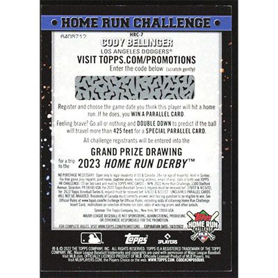 This is a 2022 Topps Home Run Challenge Code Cards Cody Bellinger baseball card. The card is #HRC-7 and pictures show condition. Team(s): Los Angeles Dodgers