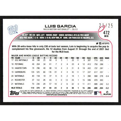 This is a 2022 Topps Mini Pink Luis Garcia baseball card. The card is #472 and pictures show condition. This card is limited; #'d 24/25. Team(s): Washington Nationals