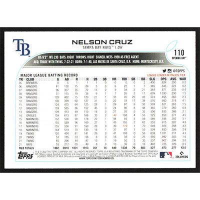 This is a 2022 Topps Opening Day Nelson Cruz baseball card. The card is #110 and pictures show condition.