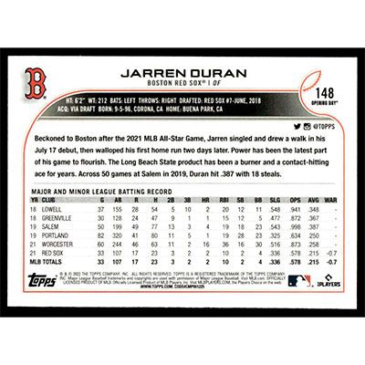 This is a 2022 Topps Opening Day Jarren Duran baseball card. The card is #148 and pictures show condition.