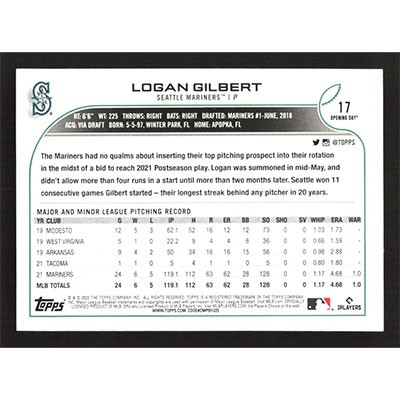 This is a 2022 Topps Opening Day Logan Gilbert Future Stars baseball card. The card is #17 and pictures show condition.