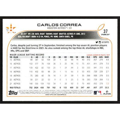 This is a 2022 Topps Opening Day Carlos Correa baseball card. The card is #37 and pictures show condition.