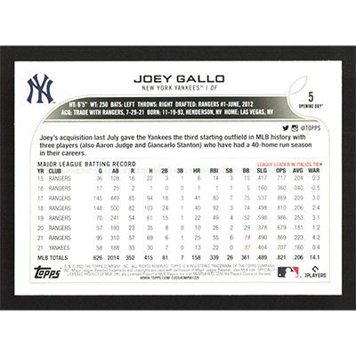 This is a 2022 Topps Opening Day Joey Gallo baseball card. The card is #5 and pictures show condition.